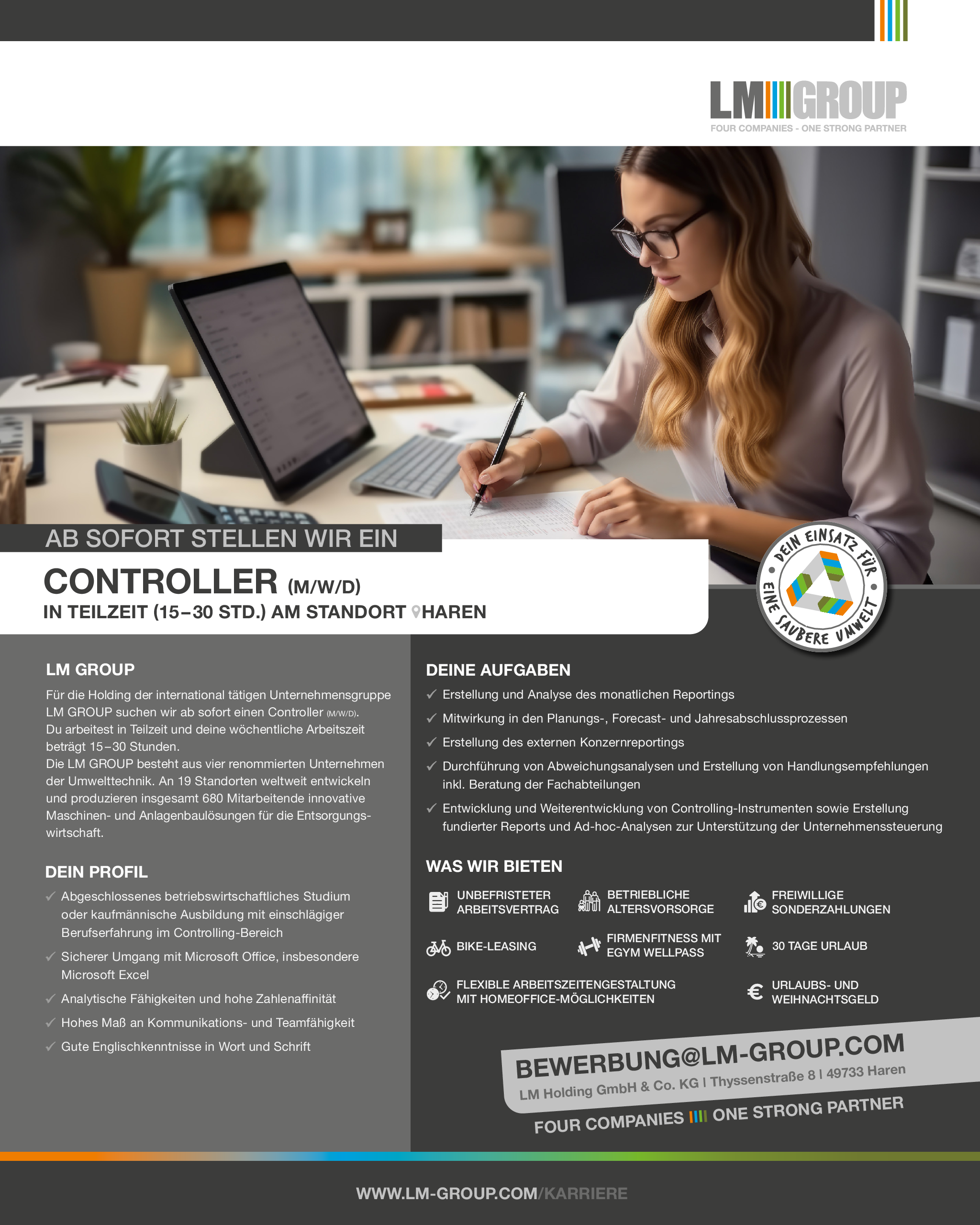 - Abgeschlossenes betriebswirtschaftliches Studium oder kaufmännische Ausbildung mit einschlägiger Berufserfahrung im Controlling-Bereich